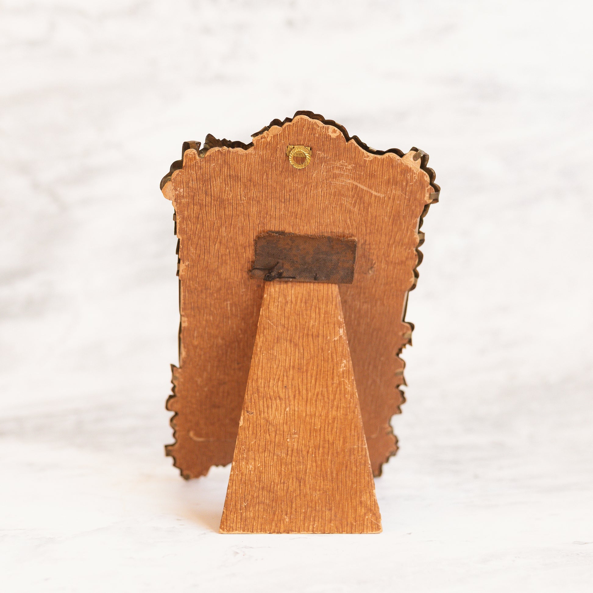 The back is fitted with its original balsa wood board, a charming detail that speaks to its age and authenticity. A simple brass hanger completes the piece, allowing it to be easily displayed on a wall or incorporated into a curated vignette. Whether styled with a treasured photograph, a small artwork, or left empty as a sculptural accent, the frame exudes an elegant, timeworn character.