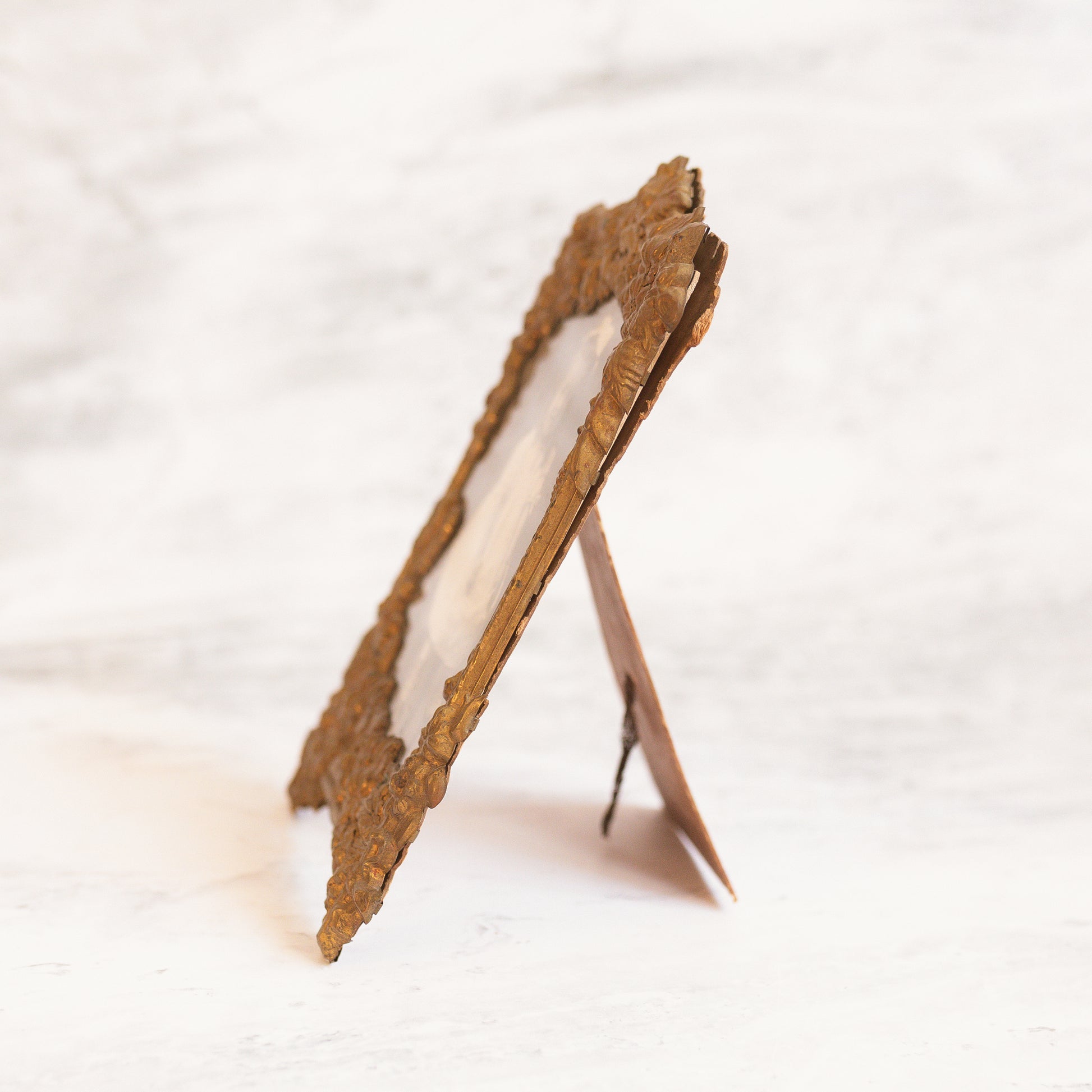 This enchanting antique cast metal frame is a testament to the delicate artistry of early decorative work. Crafted from thin, lightweight metal, its edges bloom into an intricate floral pattern, each petal and tendril shaped with graceful precision. The design strikes a beautiful balance between ornamentation and restraint, allowing the frame to feel both airy and refined.