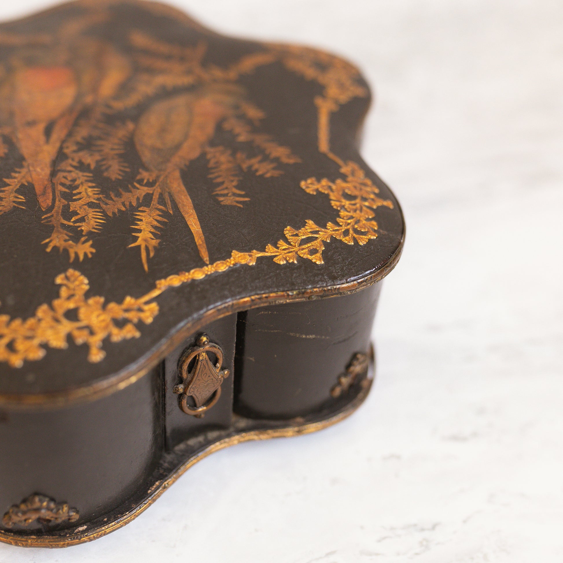 The box retains its original side panels, though two have been damaged—one missing and one present for reattachment. These imperfections speak to its long life and journey, enhancing its character rather than diminishing its beauty.