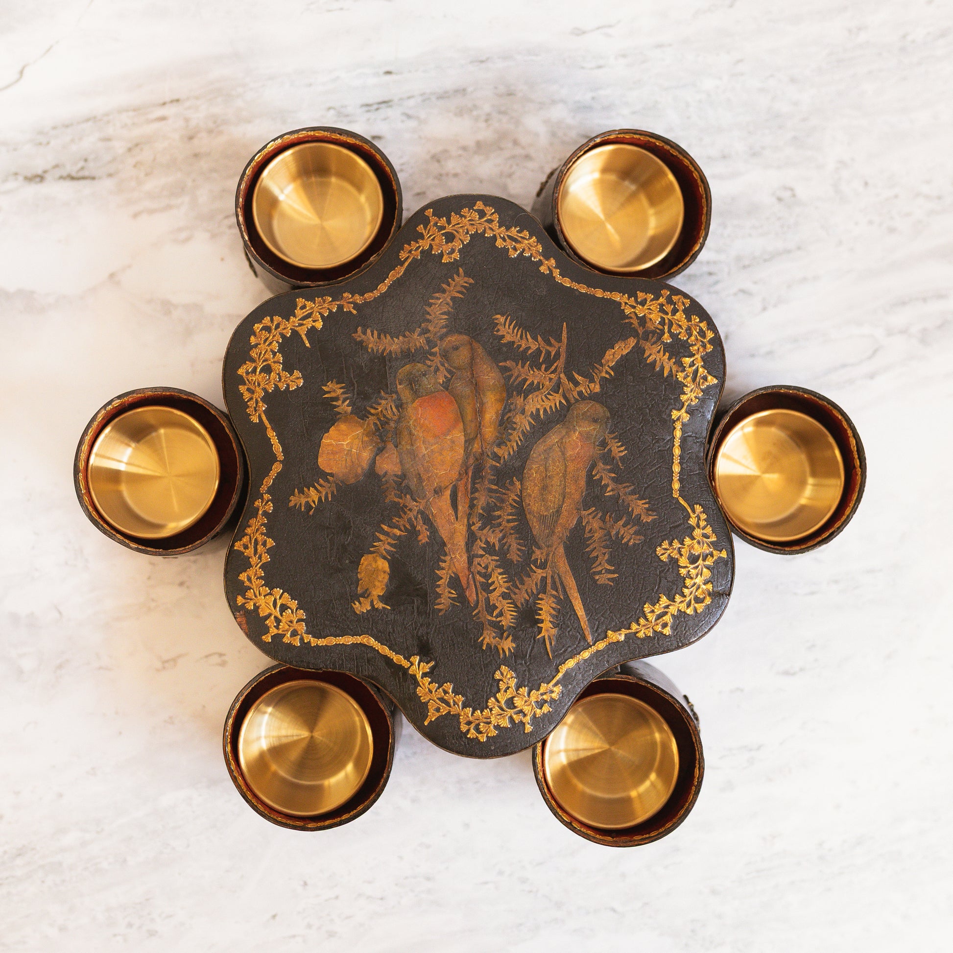 Included are six new brass ramekins, perfectly sized to nest within the compartments, their warm metal surfaces adding a quiet radiance to the interior. These vessels offer both function and authenticity for your next gathering.