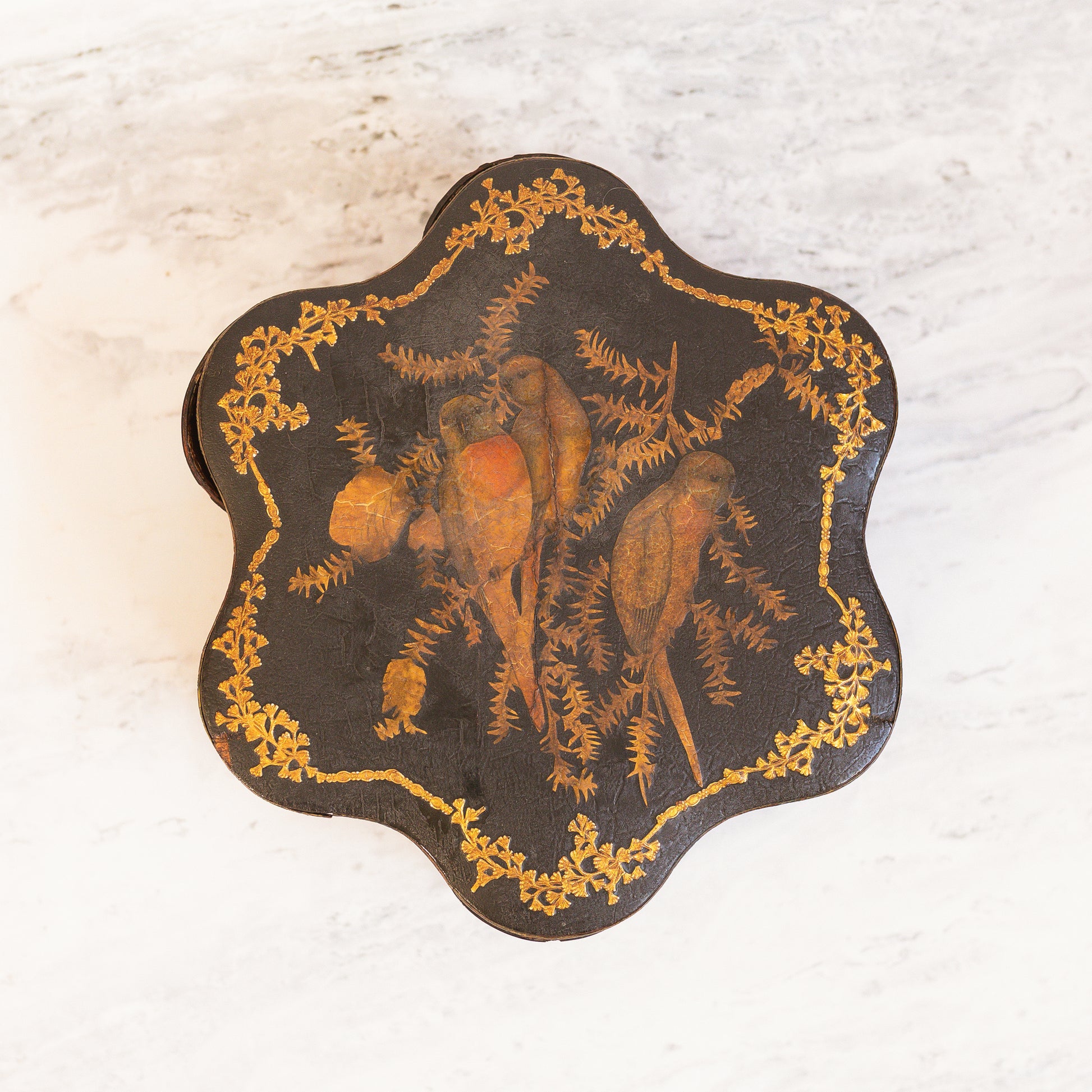 This remarkable antique East Asia spice box is a rare and evocative piece of culinary history, blending craftsmanship, artistry, and timeworn charm. The wooden body is crowned with a richly textured leather top, beautifully decorated with two parrots in gilded relief—a lively and symbolic motif that brings elegance and storytelling to the piece. The piece rotates to reveal six interior compartments, each lined with traditional paper mâché, a testament to the thoughtful construction methods used in early Chinese domestic wares.