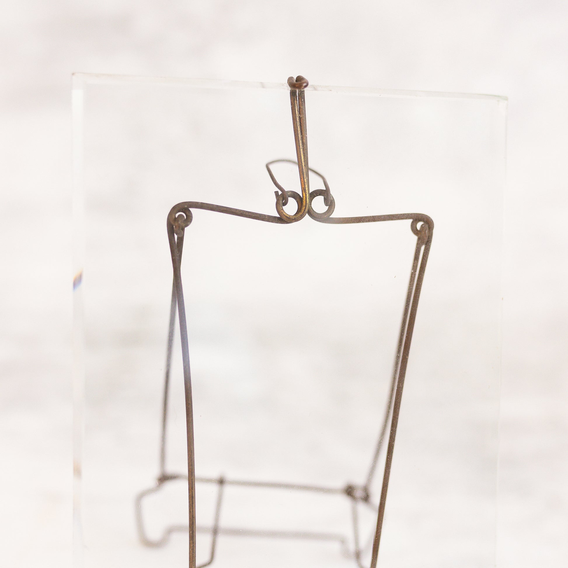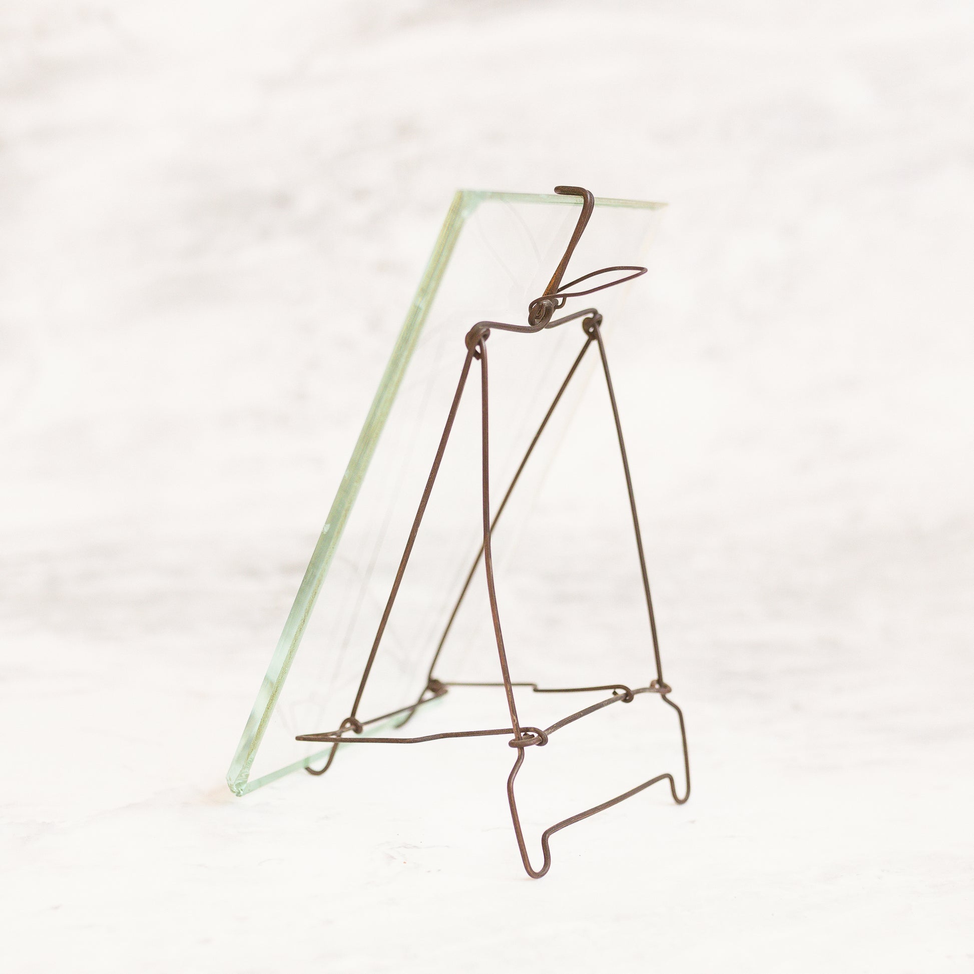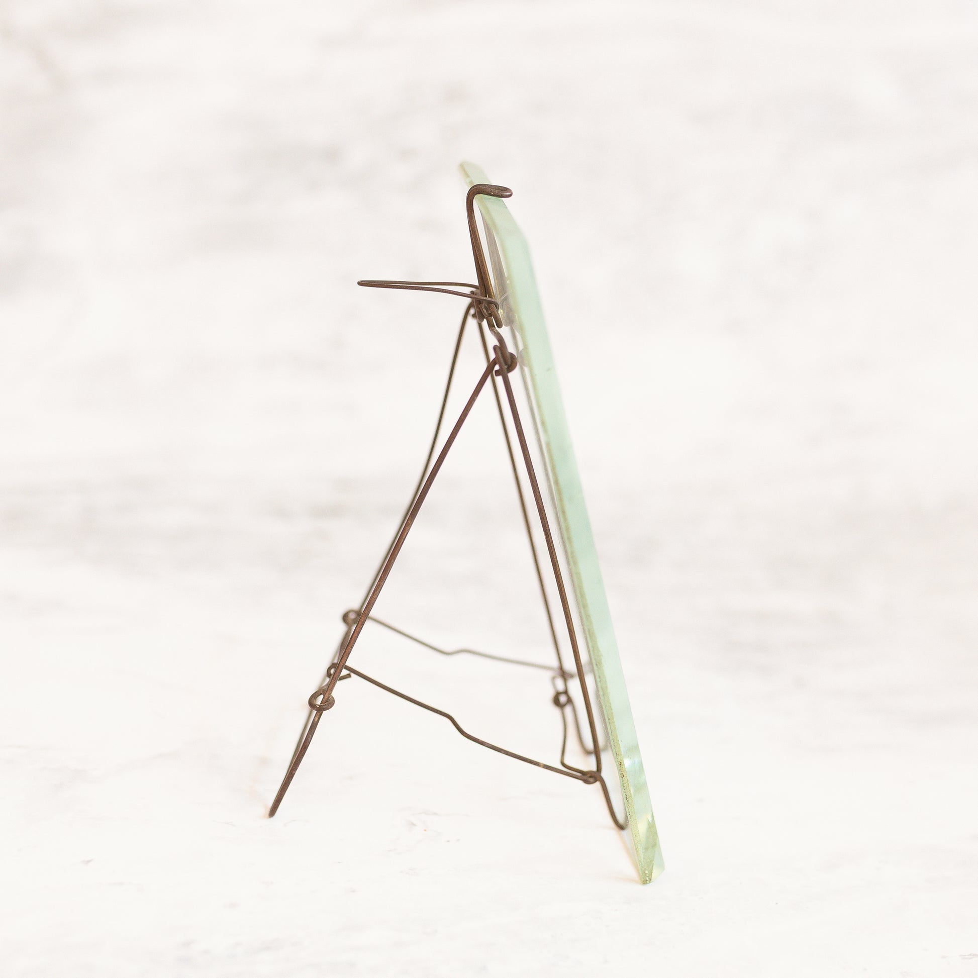 This rare antique French spring-form frame is a study in understated elegance and ingenious design. Crafted with an open back, the frame proudly reveals its rustic, primitive, and sculptural spring easel—an artful coil of metal that wraps gracefully around a pane of beautifully beveled glass. The result is a display piece that feels both delicate and architectural, celebrating the mechanics typically hidden from view.