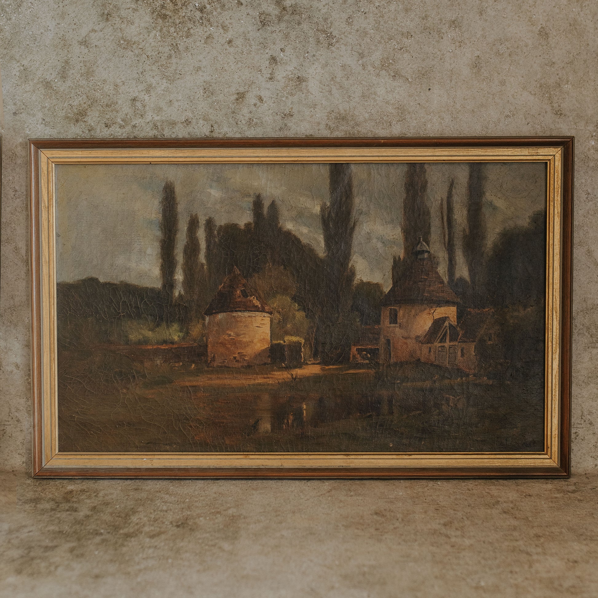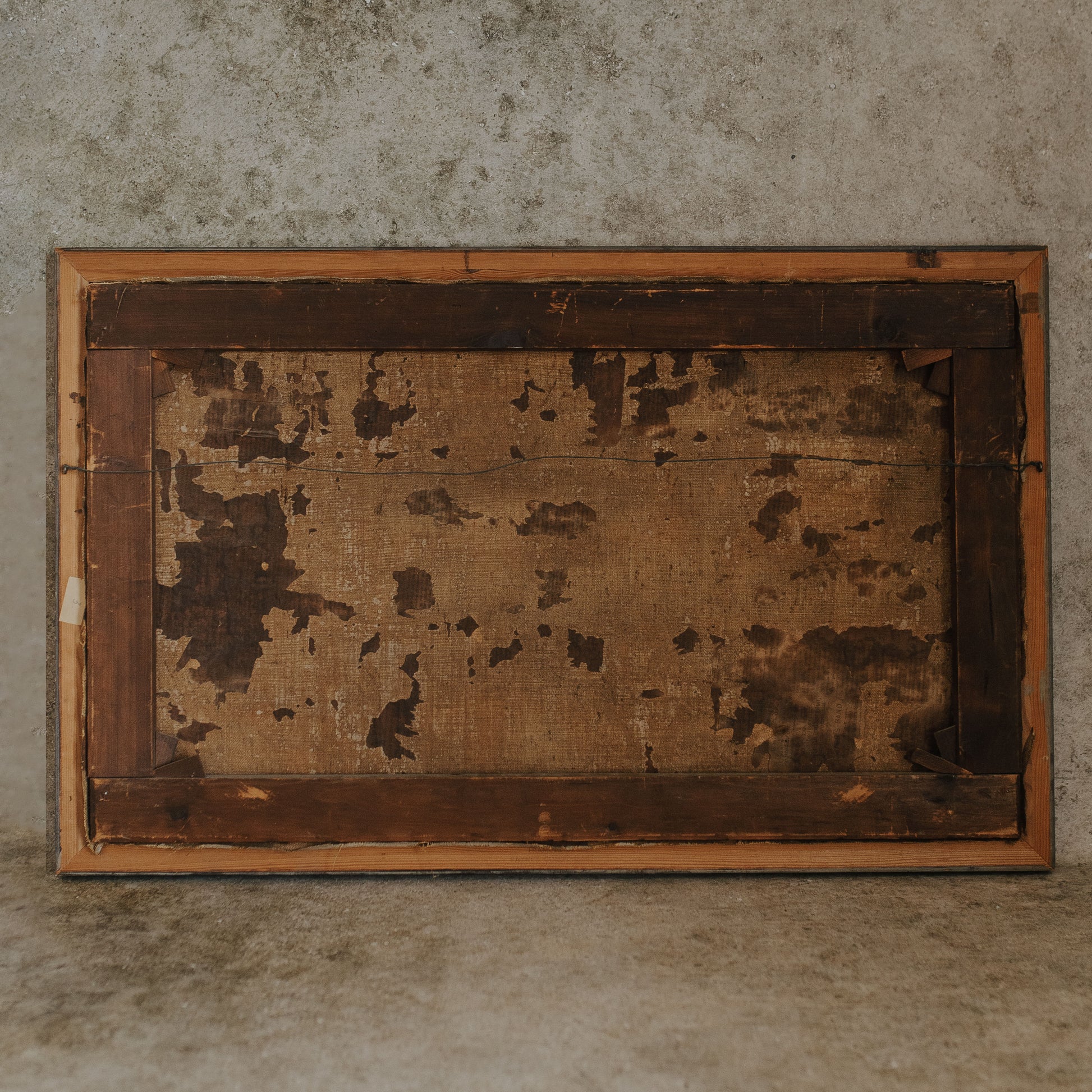 The painting is stretched on its original European stretcher and housed in a simple, elegant wooden frame that enhances its understated beauty. While the front of the canvas remains in excellent condition, with vivid tones and fine surface integrity, the reverse bears the gentle marks of time—subtle patina and aging to the canvas, authenticating its 19th-century origin.