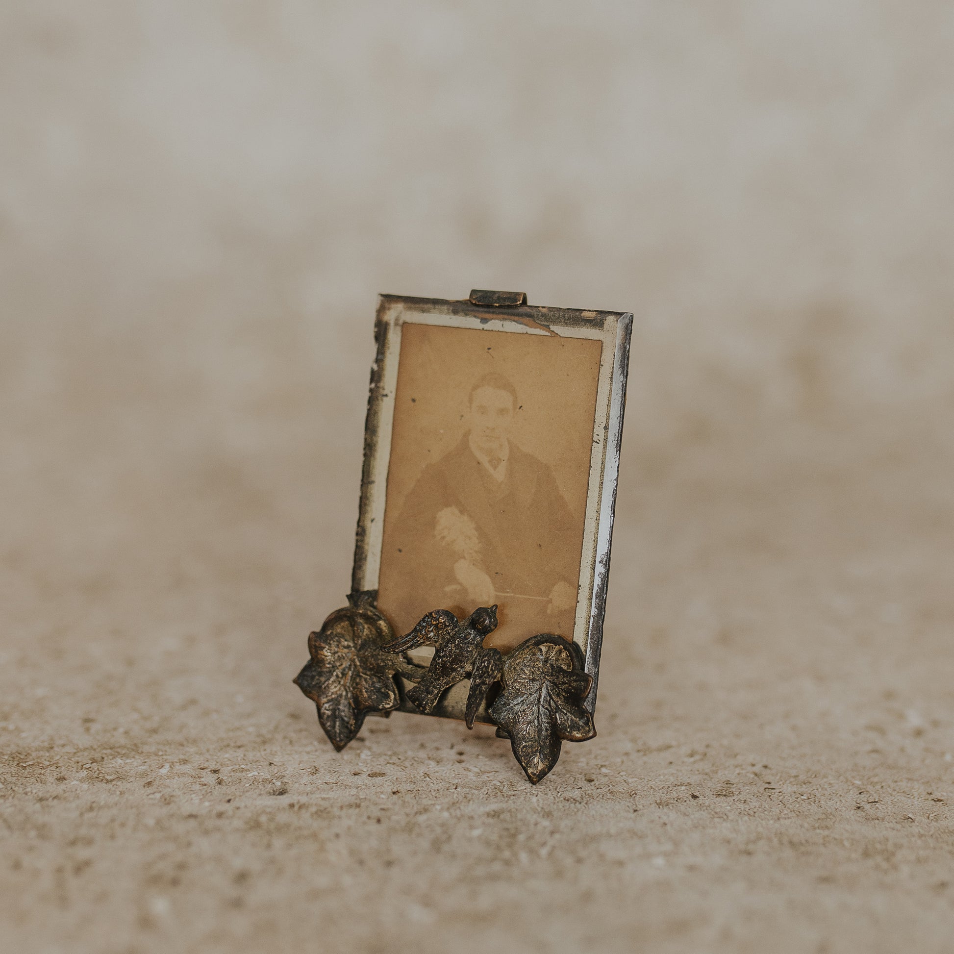 A delicate miniature French picture frame, exquisitely crafted and full of charm. The frame features a lovely decorative motif of birds and leaves across the bottom—an elegant touch that reflects the romantic artistry of early French design.
