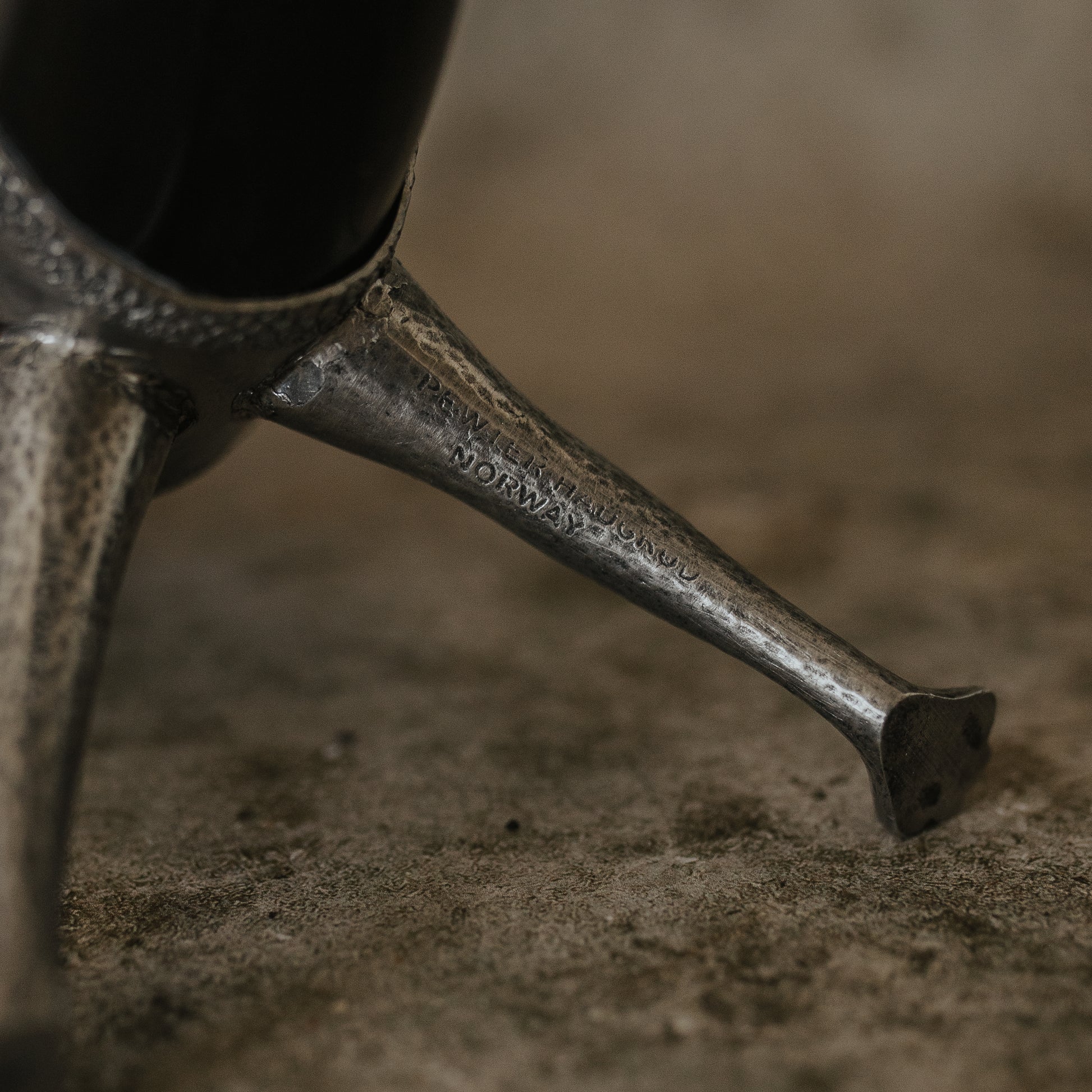 Hand made by Haugrud Pewter, Norway, this vintage viking drinking (or Saga) horn, is a beautiful and interesting piece of Norwegian craftsmanship. Featuring stamped designs in the pewter and anamorphic legs with a sleek, black horn at the center. Hallmarks are stamped on the inside of either leg.