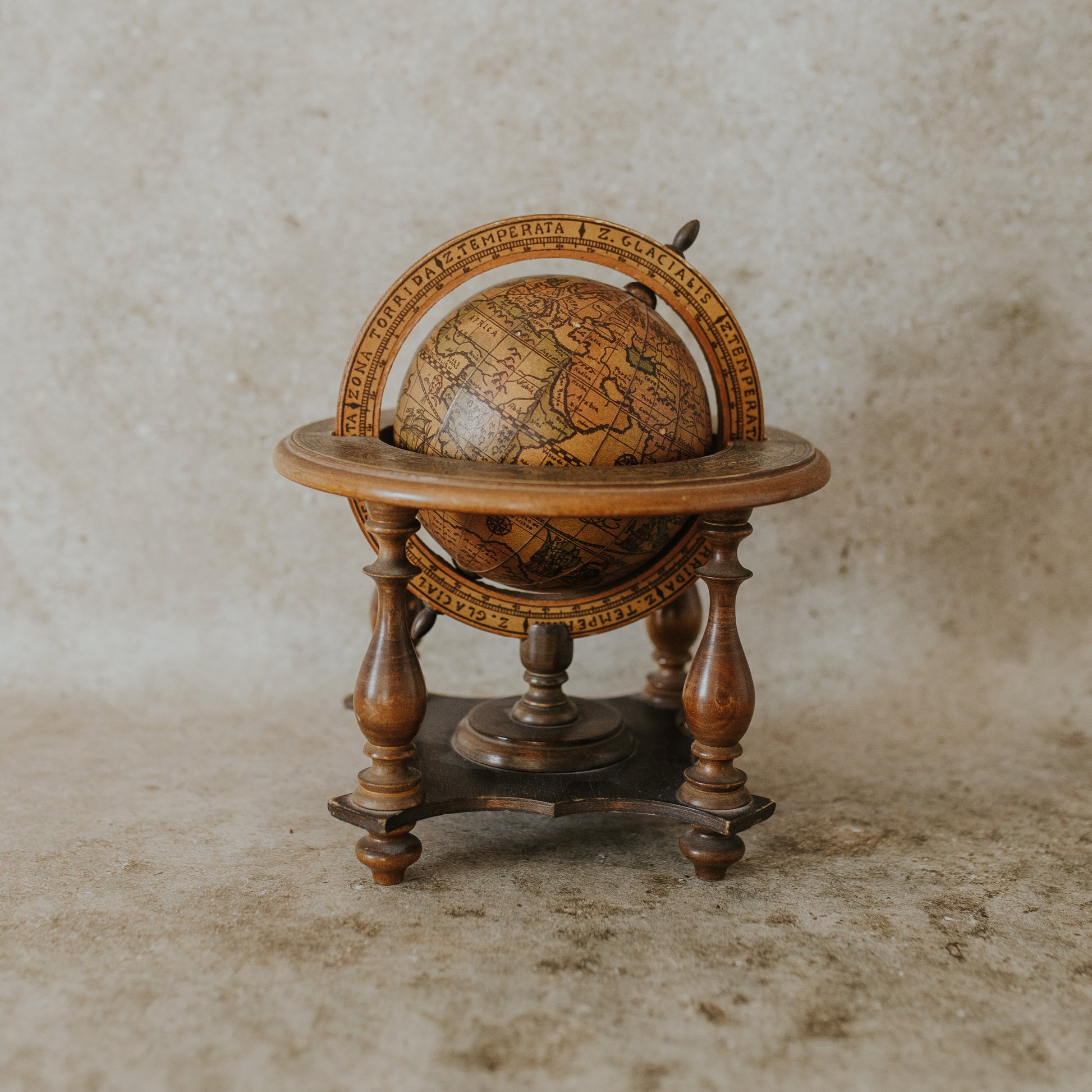 A must-have for any office, library, or lounge space. This vintage wooden desk globe sits on a wooden stand and features a beautiful decoupage design.